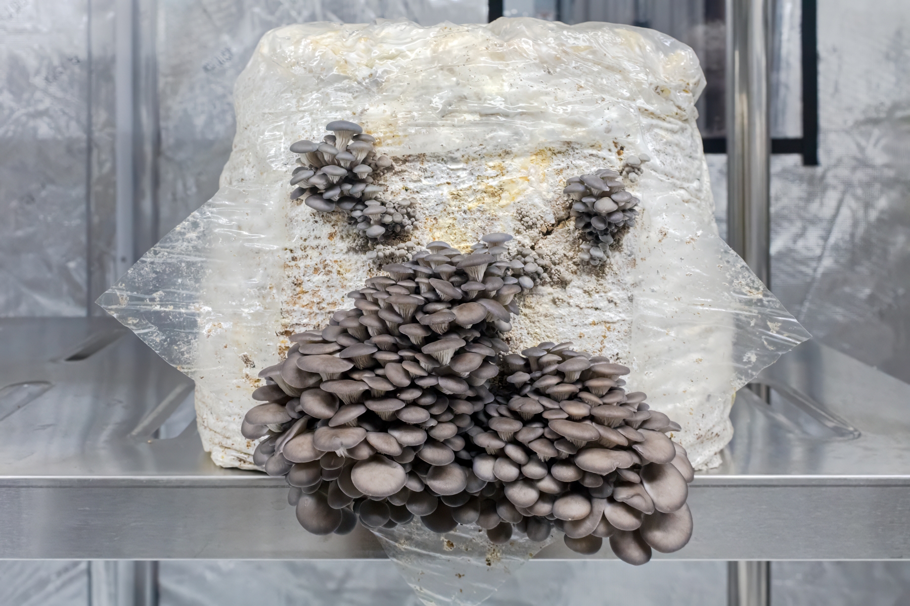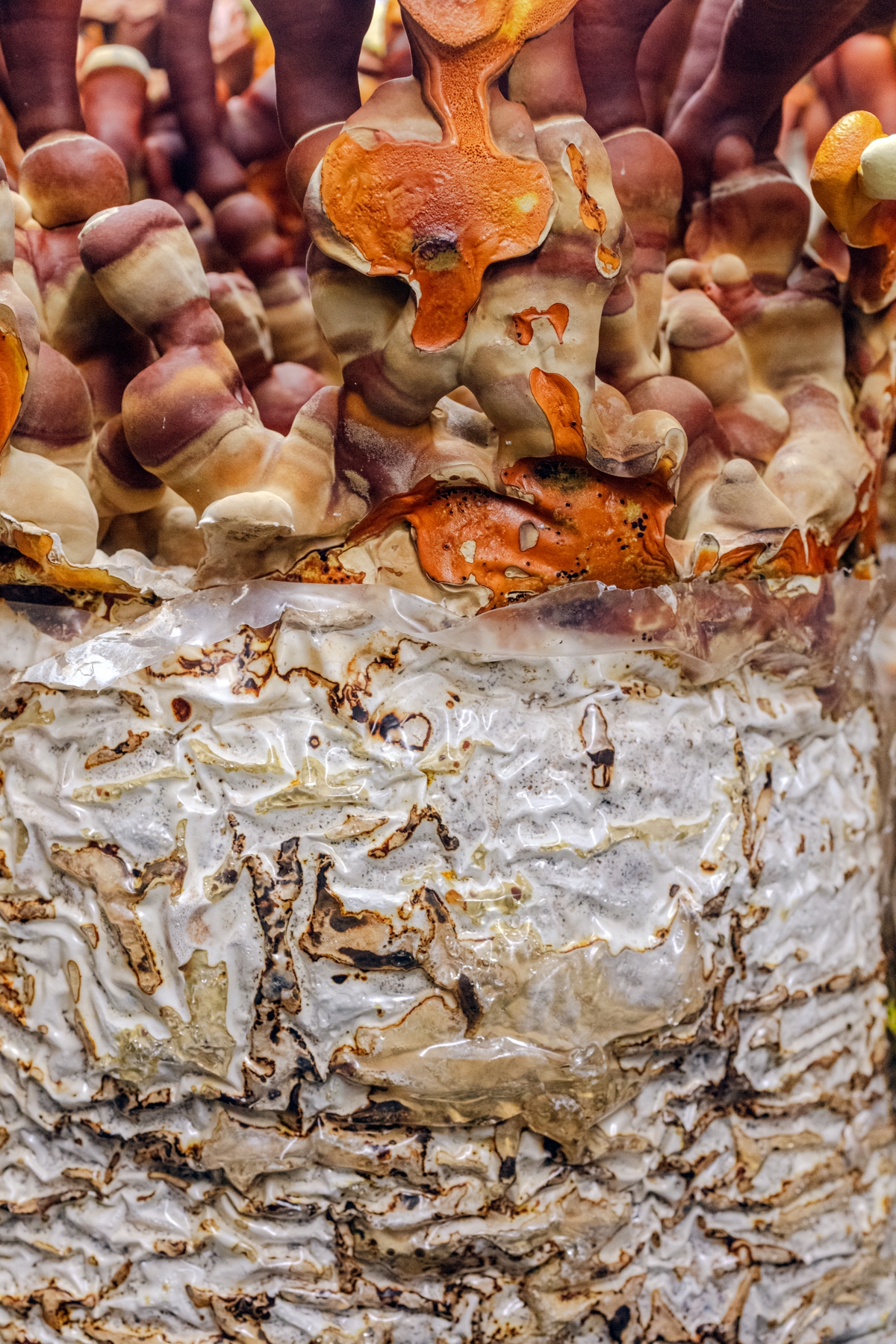 Mushroom spores are introduced into bags filled with grain from the farm. The spores then colonize the entire block of grain which is subsequently added into a mushroom substrate consisting of a soy hull and oak substrate mix. Each seed of grain becomes a vessel for the mycelium to take over and colonize that substrate.